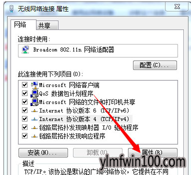 在打开的无线网络连接属性的的对话框,点击internet协议版本 4 (TCp/ipv4),点击属性。