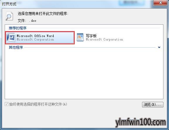 5、然后在推荐程序下选择“Microsoft officeword”点击确即可。