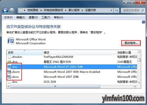4、在格式名称列表中找到“.doc”、“.docm”、“docx”,分别选中这几个类型,然后点击“更改程序”;