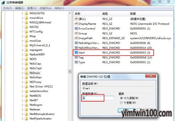 5、再双击start项把数据数值改成“2”再点击确定。再创建一个二进制值,关闭注册编辑器就可以了。
