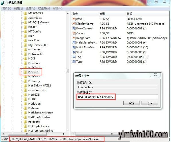 4、在services中找到“ndisuio”点击,然后在右侧中找到“displayname”双击打开看数据数值是否为“ndis Usermode i/o protocol”。
